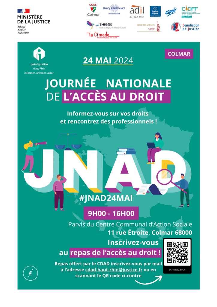 Avec notre partenaire, le centre communal d’action sociale, Nous vous accueillons au 11 rue Etroite à Colmar de 9h à 16h00 pour rencontrer des avocats, les associations d’accès au droit (ESPOIR, ADIL, CIDFF, THEMIS…) et de nombreux autres partenaires, dont les signataires de la Charte de l’accès au droit (Cimade, Caritas…).